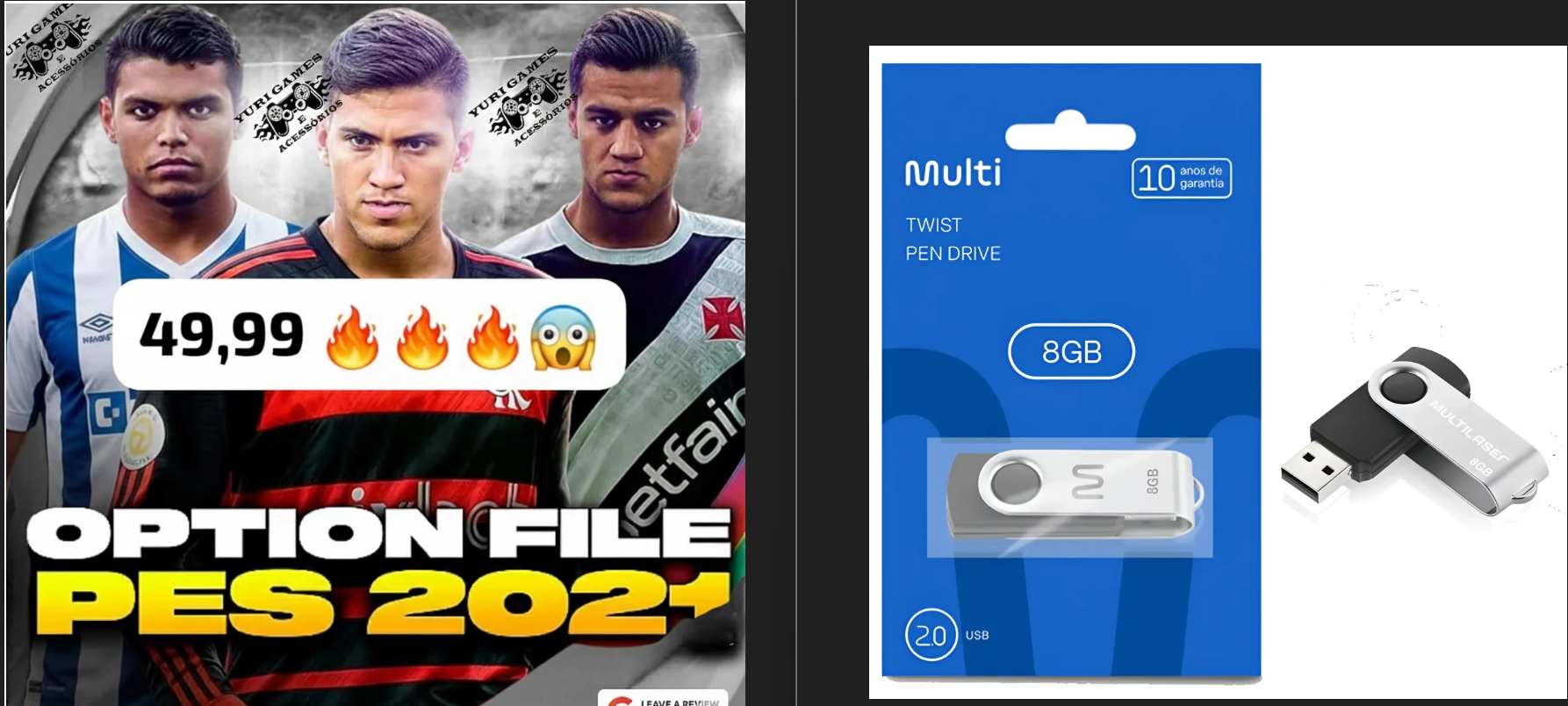 OPTION FILE PES 2020 OU 21 ATUALIZADO 2026 + Pendrive 8GB Multi Twist Pen Drive (PS4 e PS5) perfeito pra quem não tem PC enm cabo OTG mas gostaria de atualizar o seu jogo, nesse kit já vai pendrive com Option file instalado só conectar no game e realizar processo do passo a passo.